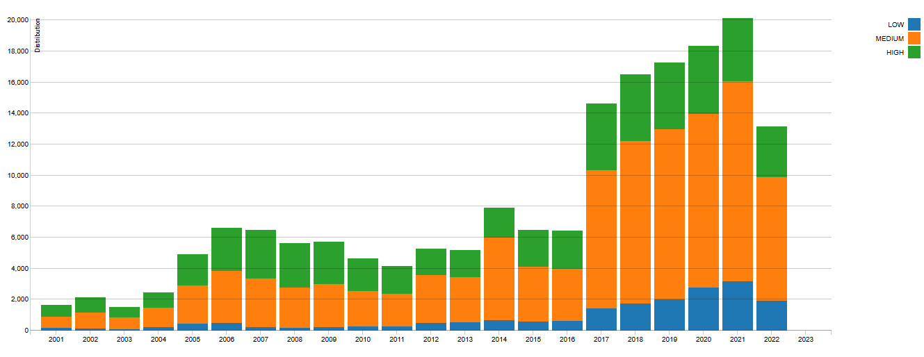 Not all software vulnerabilities represent the same amount of risk. This chart shows the severity of vulnerabilities published between 2001 and 2022:
