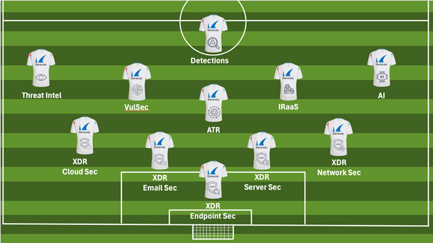 - Up front: Detections, threat intelligence, vulnerability security, incident response and AI act as strikers and playmakers. They spot danger early and take decisive action.