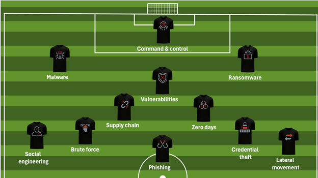 Cyber adversaries today operate like professional sports teams. They do not act as random hackers but as structured, role-based squads. Each tactic is designed to break down defenses. Phishing and social engineering lure users to malware, and brute-force attacks create pressure. Then ransomware and command-and-control deliver the final blow.
