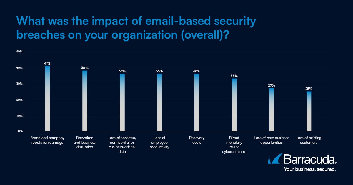 The findings show that 41% of email breach victims suffered reputational damage. Many report that business operations were disrupted, productivity declined, and a significant proportion lost new business opportunities and customers, harming growth.