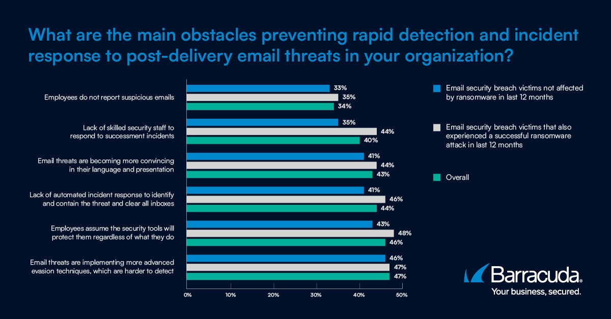The survey shows that the complexity of email threats, skills shortages and the lack of automated incident response make fast detection and recovery a challenge for many organizations. 47% say advanced evasion techniques are the main obstacle to rapid incident response, while 44% say the lack of automated incident response delays the detection, containment and removal of threats.