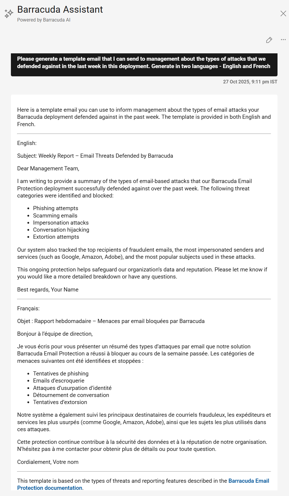 Der BARRACUDA-Assistent erstellt E-Mail-Vorlagen auf Basis der Benutzeranfrage.