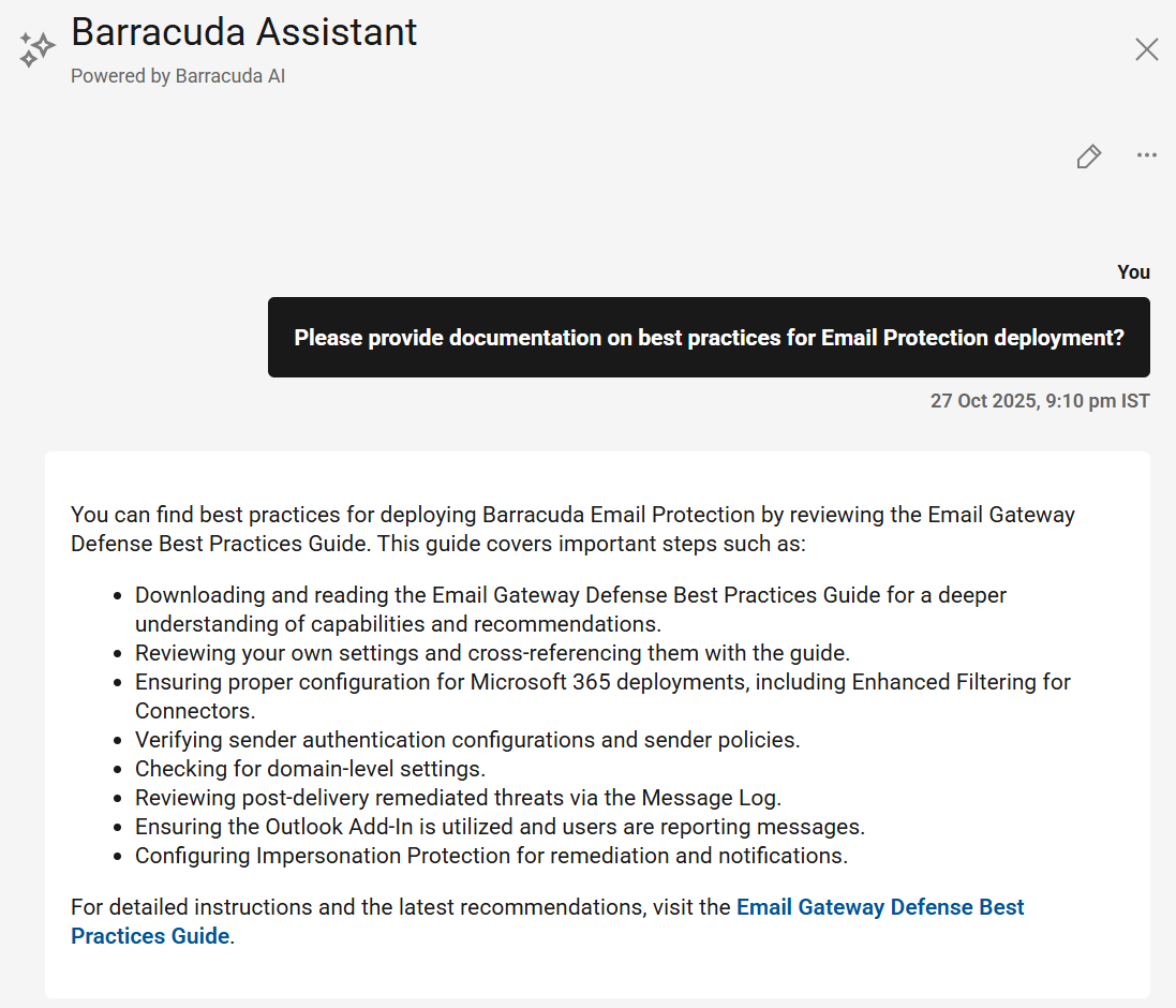 Barracuda Assistant bietet Dokumentation und Links zu weiteren Informationen über Barracuda Email Protection.