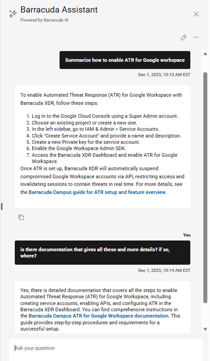 - Barracuda Assistant, an AI-powered support tool, is now integrated directly into the Barracuda Managed XDR dashboard for seamless, in-context help.