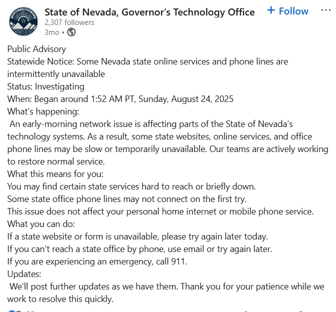 Public advisory by the State of Nevada Governor's Technology Office, posted on LinkedIn