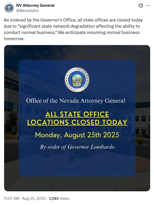 In August 2025, Nevada state government systems suddenly went offline. What initially appeared to be a routine outage turned out to be a full-scale ransomware attack affecting more than 60 state agencies—including Department of Motor Vechiles (DMV) systems, social services, law enforcement, state payroll, and more. Some systems remained offline for 28 days.