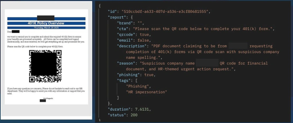 In the following sample from a real campaign, you see a malicious QR code that was embedded in a pdf email attachment. Multimodal AI renders the PDF, locates the QR code visually, decodes its contents, analyzes the destination for risk, and—if needed—executes the link in a sandbox to detect malicious behavior in real time. More details, samples and detection rate comparisons are in this blog.