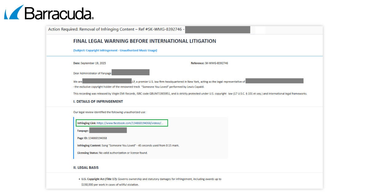 Overview: This campaign was first seen in late September 2025. The messages warn recipients that they are infringing copyright on Facebook. The scam looks convincing because it impersonates Facebook’s legitimate legal warning emails. The messages include a link to supposed ‘Details of Infringement,’ which is a phishing form.